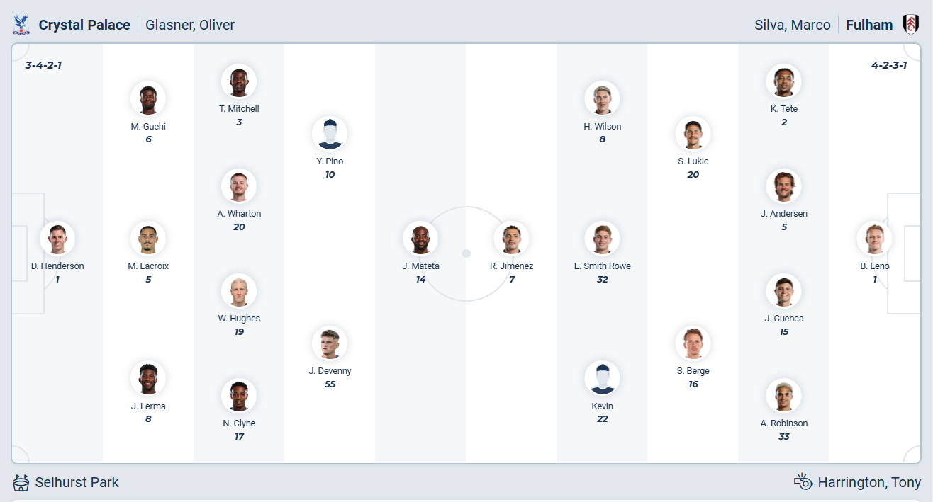 Crystal Palace từng đứng trong nhóm đầu bảng sau chuỗi trận bất bại hồi đầu mùa giải. Tuy nhiên sau đó họ chơi đuối dần, 3 trận thua liên tiếp gần đây khiến đội bóng của HLV Oliver Glasner tụt xuống vị trí thứ 9 trên bảng xếp hạng. Các cầu thủ Crystal Palace không thể để tình trạng này tiếp diễn, họ cần một kết quả tốt để xốc lại tinh thần các cầu thủ, tuy nhiên đối thủ của họ ở vòng đấu 19 lại là Fulham, đội đang có phong độ rất cao nên xem ra khả năng chiến thắng không cao. Nhiều khả năng sự cố gắng của đội chủ nhà sẽ chỉ giúp họ có được kết quả hòa.